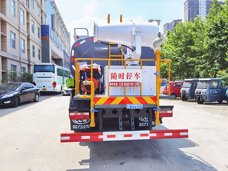 | 上裝配置:罐體采用國標Q235碳鋼板制作,可選用30米、40米中型霧炮,罐體采用機器壓板一次性成型技術,采用先進旋邊機,罐體包罐機工藝保證了罐體制作的精度和美觀。罐體厚度4mm,前后封頭5MM加厚型,罐體實際容積12立方(12噸),程力獨有烤漆工藝,多層底漆、防腐除銹,面漆噴涂。 功能齊全,配備前沖、后灑、側噴、綠化灑水炮,采用優(yōu)質水泵,合理設計水路管道,氣控取力器,作業(yè)能力強;采用柴油發(fā)電機大功率霧炮機,噴灑距離選裝30-40米射程,運用范圍廣泛。 |